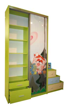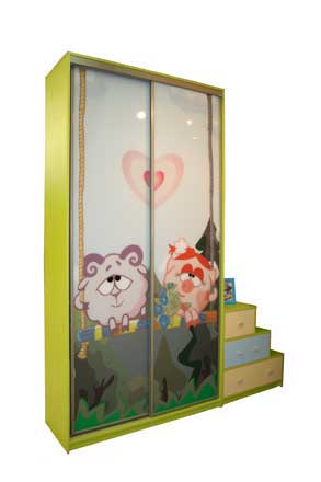 Шкаф-купе детский с комодом Материал: ЛДСП цвет «Лайм», кромка ПВХ, двери в системе KOMANDOR Печать на стекле. Размеры: 1200х2400х450мм Стоимость 32 530 руб. Возможны любые цветовые решения ЛДСП. Разнообразный дизайн фасадов с применением рисунков и фотографий (а также собственное фото). Комод-лестница с выдвижными ящиками Материал: ЛДСП, кромка ПВХ. Размеры: 700х750х400мм Стоимость 4 650 руб.