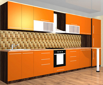 Кухонный гарнитур. Фасады: МДФ в пленке Орнаж глянец, витрины — алюминиевый профиль и стекло Мателюкс. Корпуса ДСП Олива шоколад. Столешница постформинг 28 мм.