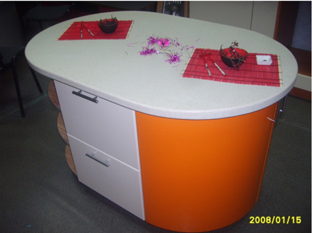 Короб ЛДСП,столешница искусственный камень, фасады МДФ крашенный гнутый.Кухонный остров стоит на хромированных ножках. Петли на распашных дверях с гасителями удара, ящики с доводчиками.