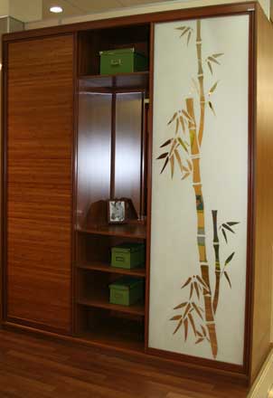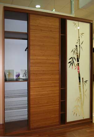 Шкаф-купе корпусный Материал: ЛДСП цвет «Орех французский», двери в системе KOMANDOR алюминий. 1 дверь «Натуральный Бамбук», 1 зеркало матированное с рисунком. Размеры: 1850х2400х600мм Стоимость от 31 210 руб. Возможны любые цветовые решения ЛДСП. Разнообразный дизайн фасадов с применением рисунков и фотографий (а также собственное фото).